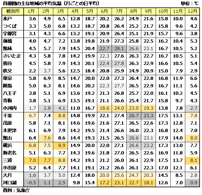 北海道や沖縄と比べているわけではないので、どこも大きな差はありませんが、冬は千葉・茂原・木更津・館山・横浜・三浦等が比較的暖かくて過ごしやすく、山間部の秩父・小河内・大月・河口湖等は寒さが厳しそうです。河口湖は1月の平均気温がマイナス0.5℃まで下がります。夏は館林・熊谷・練馬・千葉・館山・横浜等の暑さが厳しく、小河内・大月・河口湖等が比較的過ごしやすそうです。場所によって1月の平均気温の差は7.5℃(三浦と河口湖の差)もありますが、7月は5.0℃(館林と河口湖の差)しかありません。