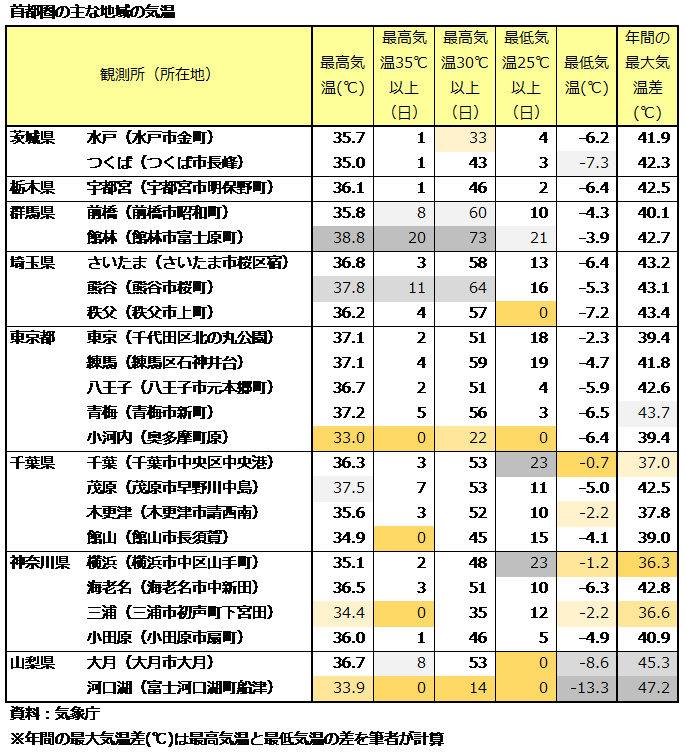 最高気温30℃以上の真夏日が最も多かったのも館林(73日)で、以下、熊谷(64日)前橋(60日)練馬(59日)と続きます。真夏日が少なかったのは河口湖(14日)小河内(22日)水戸(33日)等です。
