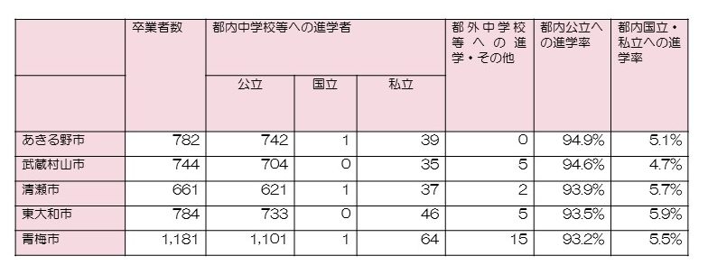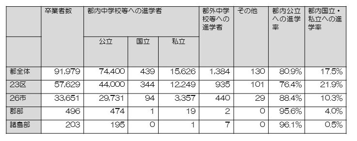 文部科学省の学校基本調査によると、都内の公立小学校に通っていた児童の80.9%が公立中学校へ進学しています。中学受験をしている児童は、私立へ進学した15,626人、国立へ進学した439人、公立に含まれている都立中学校及び都立中等教育学校へ進学した1,375人等、さらに受験はしたものの結果として公立へ進学した児童等と考えられます。公立へ進学する割合は23区で76.4%と低く、郡部や諸島部では高くなっています。