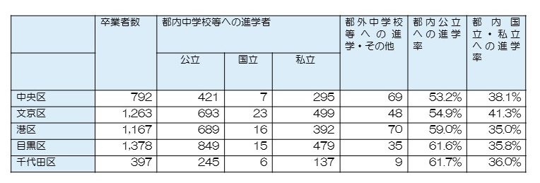 下記は都内公立小学校の卒業生(2017年3月卒業生)がどの中学校へ進学したかをまとめたものです。公立中学校への進学者には、都立中学校、区立義務教育学校、区立・都立中等教育学校への進学者を含み、国立中学校への進学者には、国立の中等教育学校への進学者を含みます。