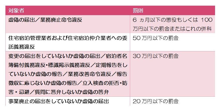 住宅宿泊事業者には、各種届出を怠ったり虚偽の届出をしたりすると下記の罰則があります。