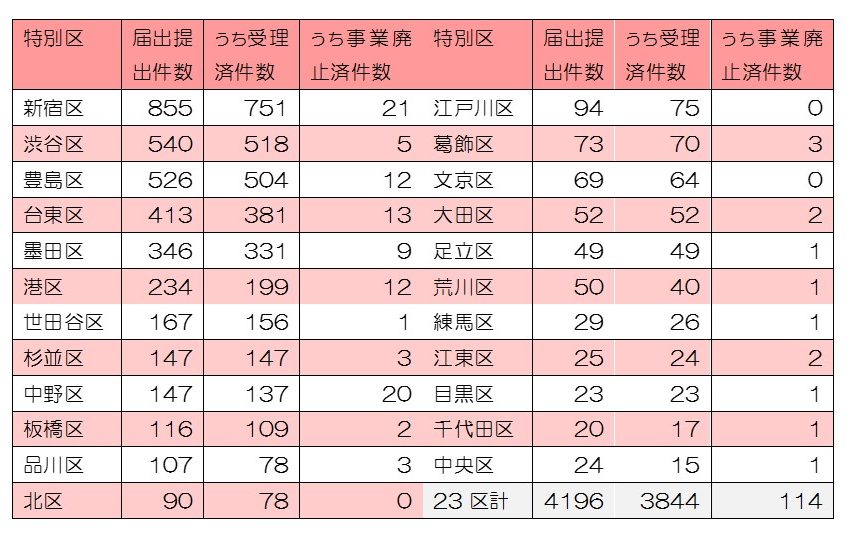 最後に東京23区の受理済件数を区ごとに確認してみました。
