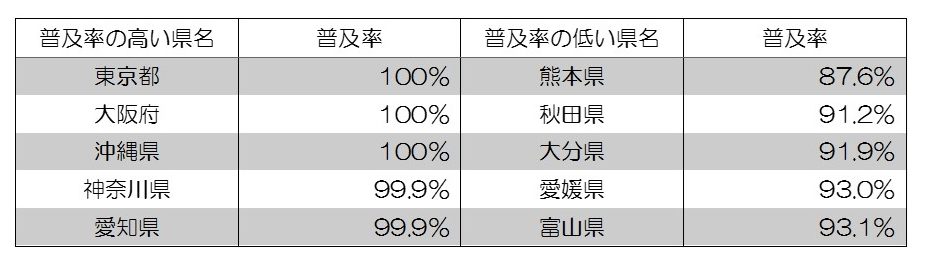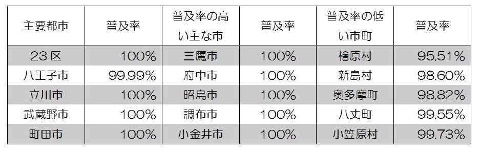 東京都は全国で一番普及率が高いので、都内区市町村は軒並み100%となっています。99%に満たないのは檜原村・新島村・奥多摩町の3町村しかなく、水道に関してはかなり恵まれていると言えます。