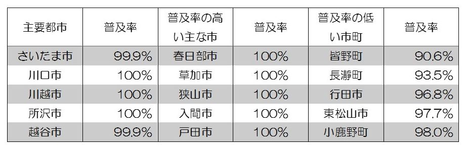 埼玉県は水道普及率が99.8%とかなり高いことから、県内各市町村も普及率はかなり高くなっています。県庁所在地のさいたま市は99.9%ですが、川口市や川越市等の20以上の市町村が100%となっており、市では行田市の96.8%が最も低く、他は県西部の町が比較的低くなっています。