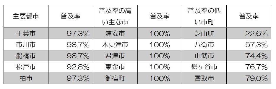 千葉県は水道普及率が95.2%で隣接する埼玉県や東京都より低く、全国平均も下回っています。普及率が100%なのは表に記載の5市町だけで、主要な都市でも県庁所在地の千葉市は97.3%、松戸市は92.8%等、意外と低い普及率となっています。県内で最も低いのは芝山町で僅か22.6%しかありません。町内で販売中の中古戸建物件をみると、軒並み「上水道:井戸」と記載されています。