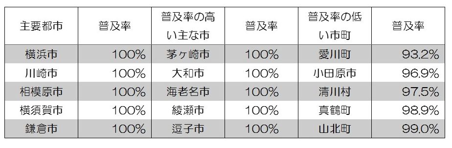 神奈川県も水道普及率は99.9%とかなり高く、県内各市町村でも横浜市や川崎市等100%が目立ちます。普及率が低いのは愛川町(93.2%)や小田原市(96.9%)等で、埼玉県と同じく県西部の市町村が比較的低くなっています。西部は山が多く、美味しい地下水が簡単に手に入るのかもしれません。