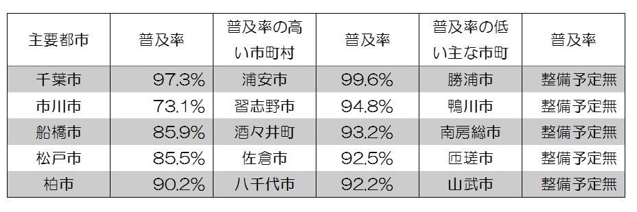 千葉県内で普及率が最も高いのは浦安市(99.6%)、次が千葉市(97.3%)、その次が習志野市(94.8%)となっています。地理的には何れも京葉地域にありますが、同地域の市川市(73.1%)や船橋市(85.9%)は高くないので、地域性や人口規模よりも財政面の差の方が影響しているのかもしれません。千葉県内には勝浦市のように整備予定がない市町村が19もあります。想像以上に多いですが、地域ごとの事情を加味し、それぞれの住民が納得して最適な方向性を決定したのでしょう。