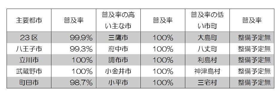 東京都は全国で一番普及率が高いので、23区は惜しくも99.9%ですが、多摩地区は26市のうち18市が100%となっています。ただ、島しょでは新島村を除いて整備予定無しとなっています。限られた島の人口や世帯で下水道を整備していくのは大変なのでしょう。