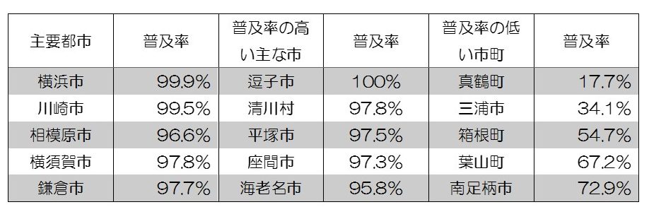 神奈川県の市町村別下水道処理人口普及率